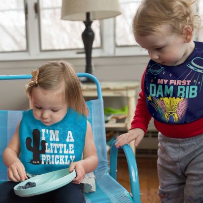 Officially licensed baby bib made of soft terry polyester front and absorbent cotton terry back. It is decorated with a fun full color imprint. Finished with adjustable baby soft hook and loop. Printed in the USA with imported fabric.
