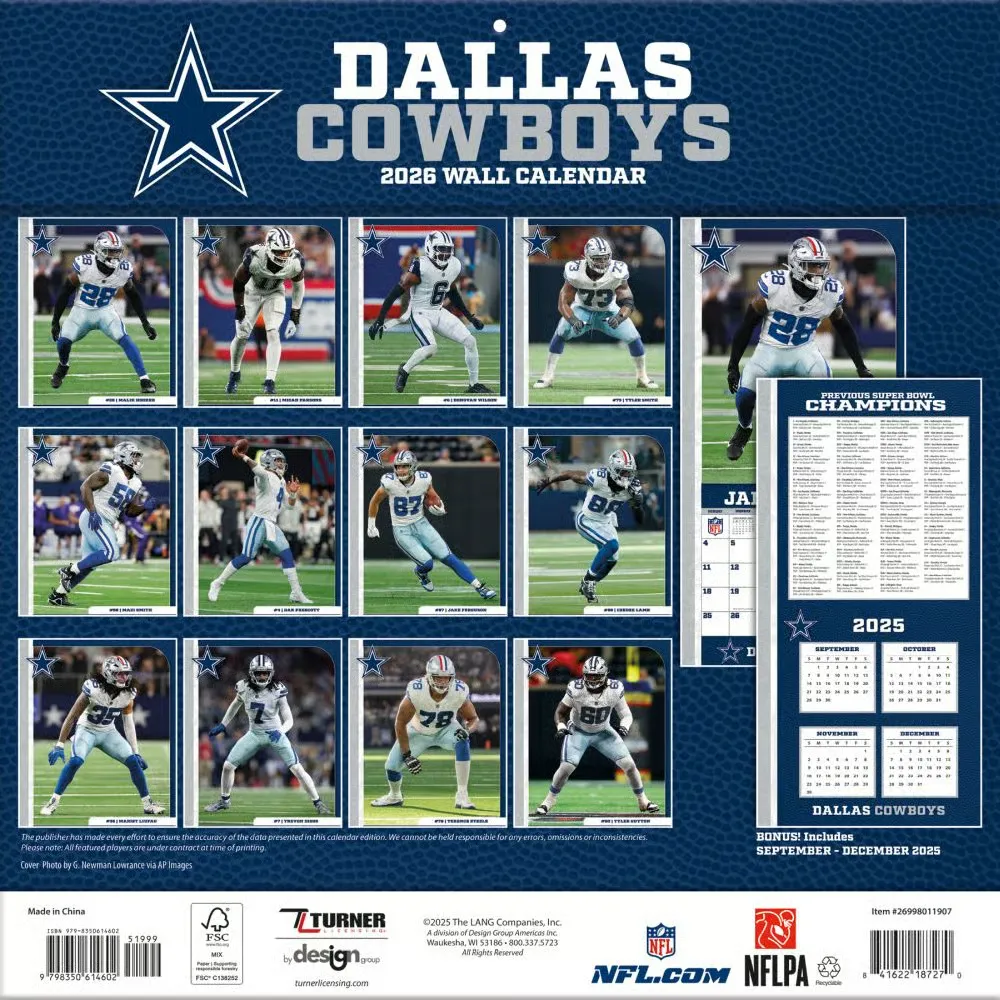 Made for passionate football fans, this team wall calendar includes poster-sized action shots of your favorite players from the Dallas Cowboys every month! Each month also includes professional athlete bios and new graphics featuring the Cowboys team colors and logos. Made with exceptional quality, the 12×12 calendar also includes bonus pages that feature Sept. – Dec. 2025 and the past Super Bowl results! 12-month format (January – December 2026). Dimensions: 12″w x 24″h (opened).