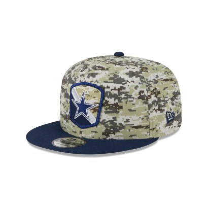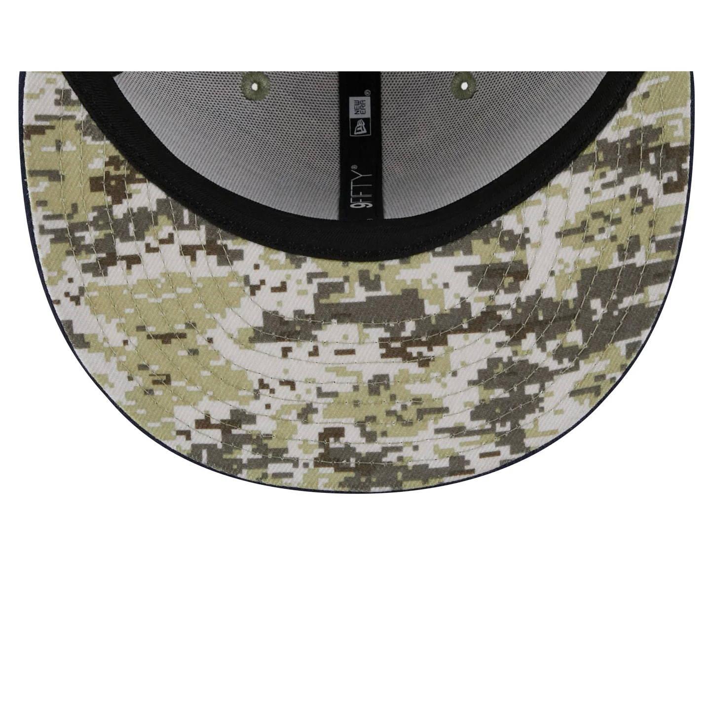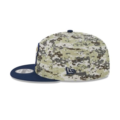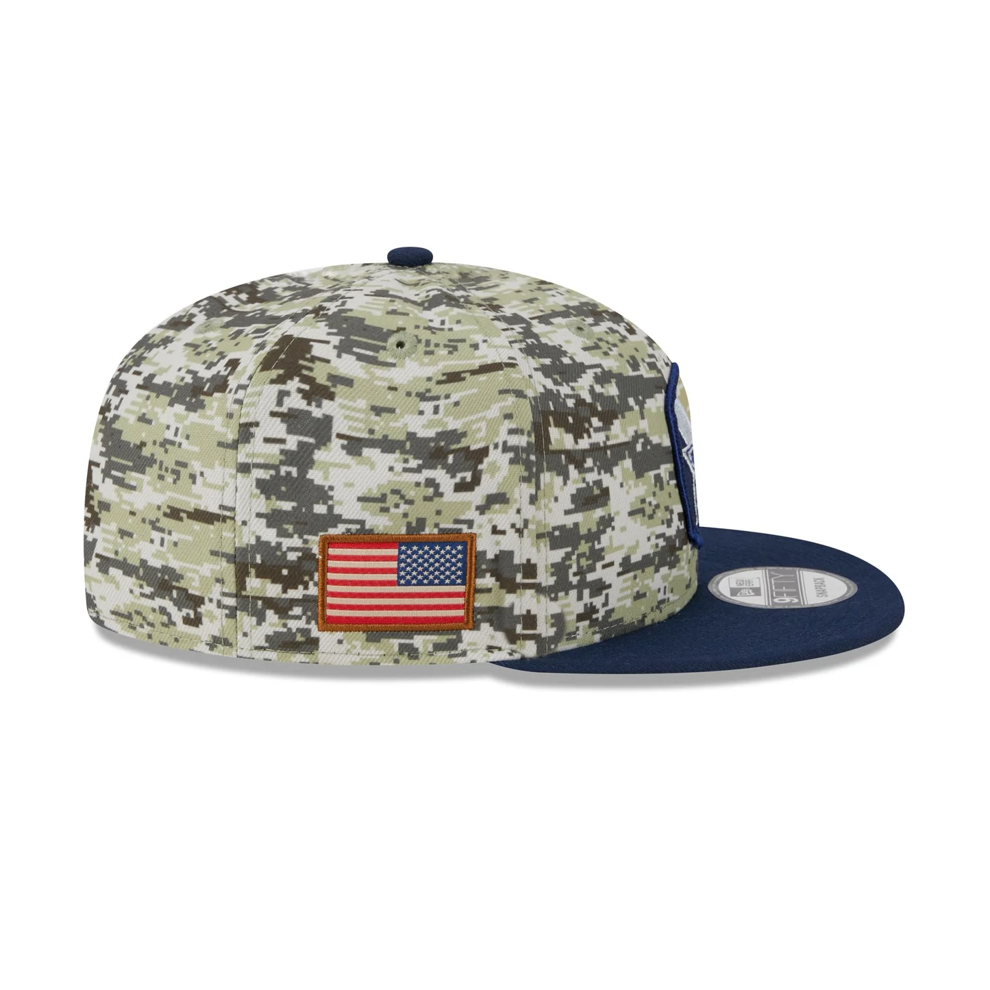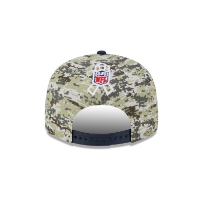 The 2023 Salute to Service Camo 9FIFTY Snapback features an embroidered team logo at the front panels with the official NFL Salute to Service patch above a snapback closure at the rear. Additional details include an American flag patch at the right-wear side with a camo crown and undervisor.