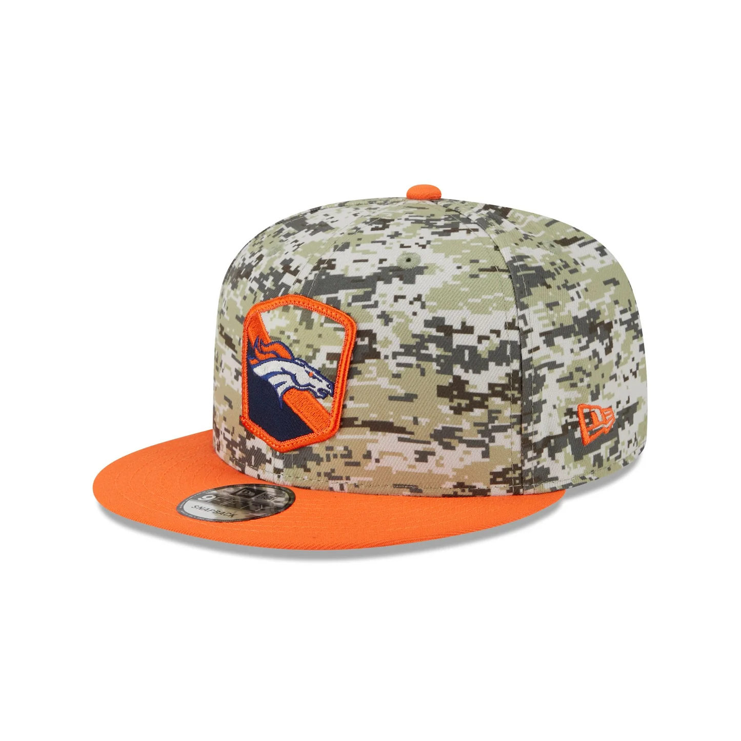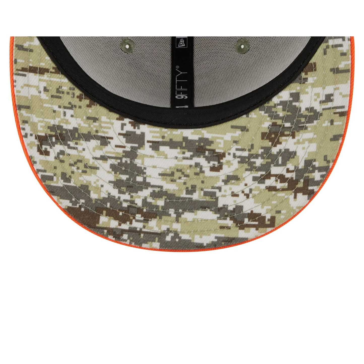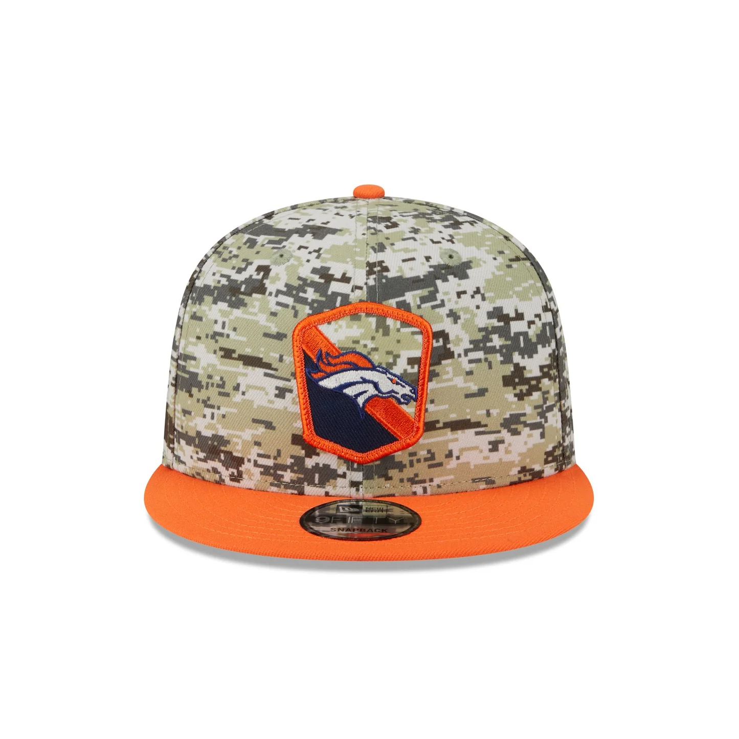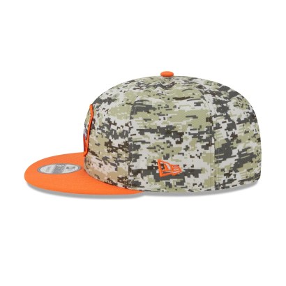 The 2023 Salute to Service Camo 9FIFTY Snapback features an embroidered team logo at the front panels with the official NFL Salute to Service patch above a snapback closure at the rear. Additional details include an American flag patch at the right-wear side with a camo crown and undervisor.