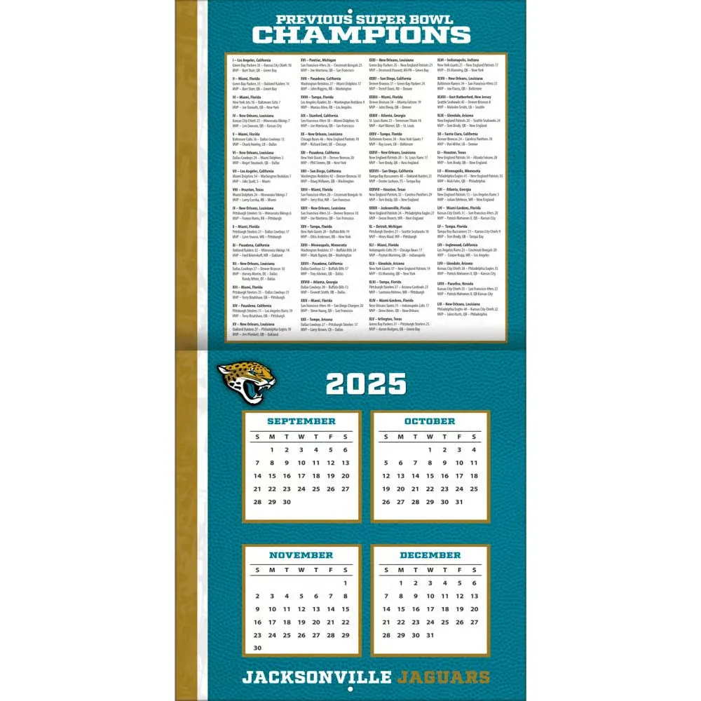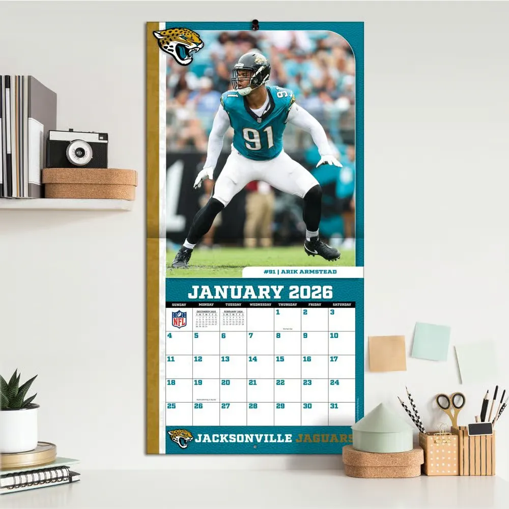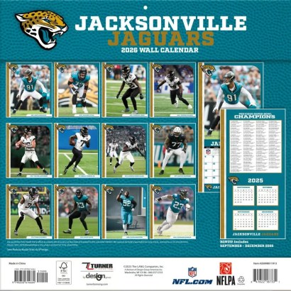 Made for passionate football fans, this team wall calendar includes poster-sized action shots of your favorite players from the Jacksonville Jaguars every month! Each month also includes professional athlete bios and new graphics featuring the Jaguars team colors and logos. Made with exceptional quality, the 12×12 calendar also includes bonus pages that feature Sept. – Dec. 2025 and the past Super Bowl results! 12-month format (January – December 2026). Dimensions: 12″w x 24″h (opened).