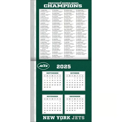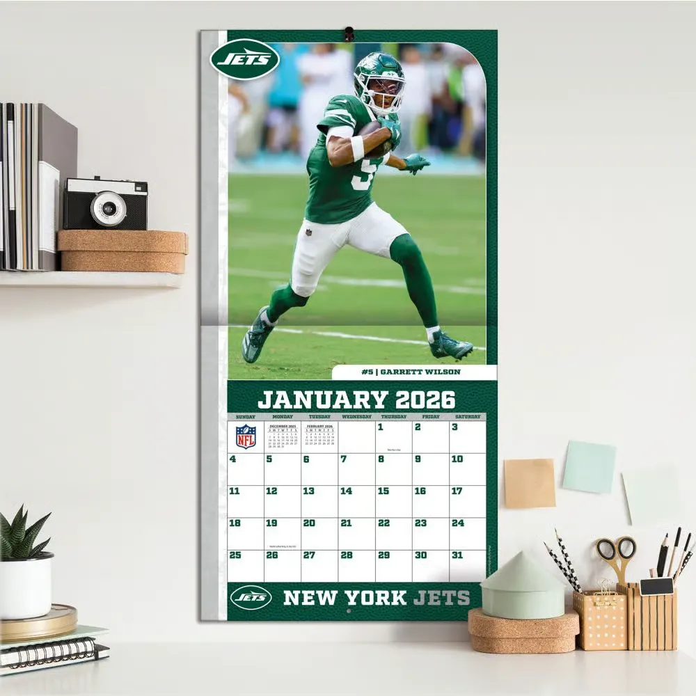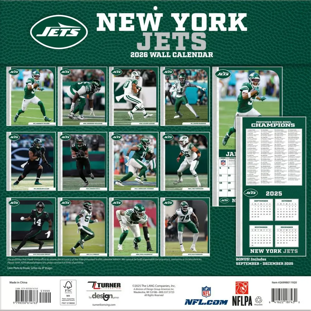 Made for passionate football fans, this team wall calendar includes poster-sized action shots of your favorite players from the New York Jets every month! Each month also includes professional athlete bios and new graphics featuring the Jets team colors and logos. Made with exceptional quality, the 12×12 calendar also includes bonus pages that feature Sept. – Dec. 2025 and the past Super Bowl results! 12-month format (January – December 2026). Dimensions: 12″w x 24″h (opened).
