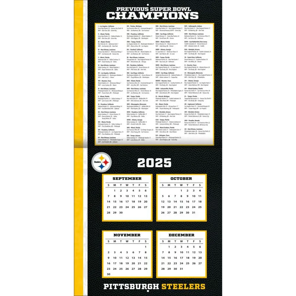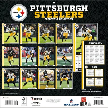 Made for passionate football fans, this team wall calendar includes poster-sized action shots of your favorite players from the Pittsburgh Steelers every month! Each month also includes professional athlete bios and new graphics featuring the Steelers team colors and logos. Made with exceptional quality, the 12×12 calendar also includes bonus pages that feature Sept. – Dec. 2025 and the past Super Bowl results! 12-month format (January – December 2026). Dimensions: 12″w x 24″h (opened).